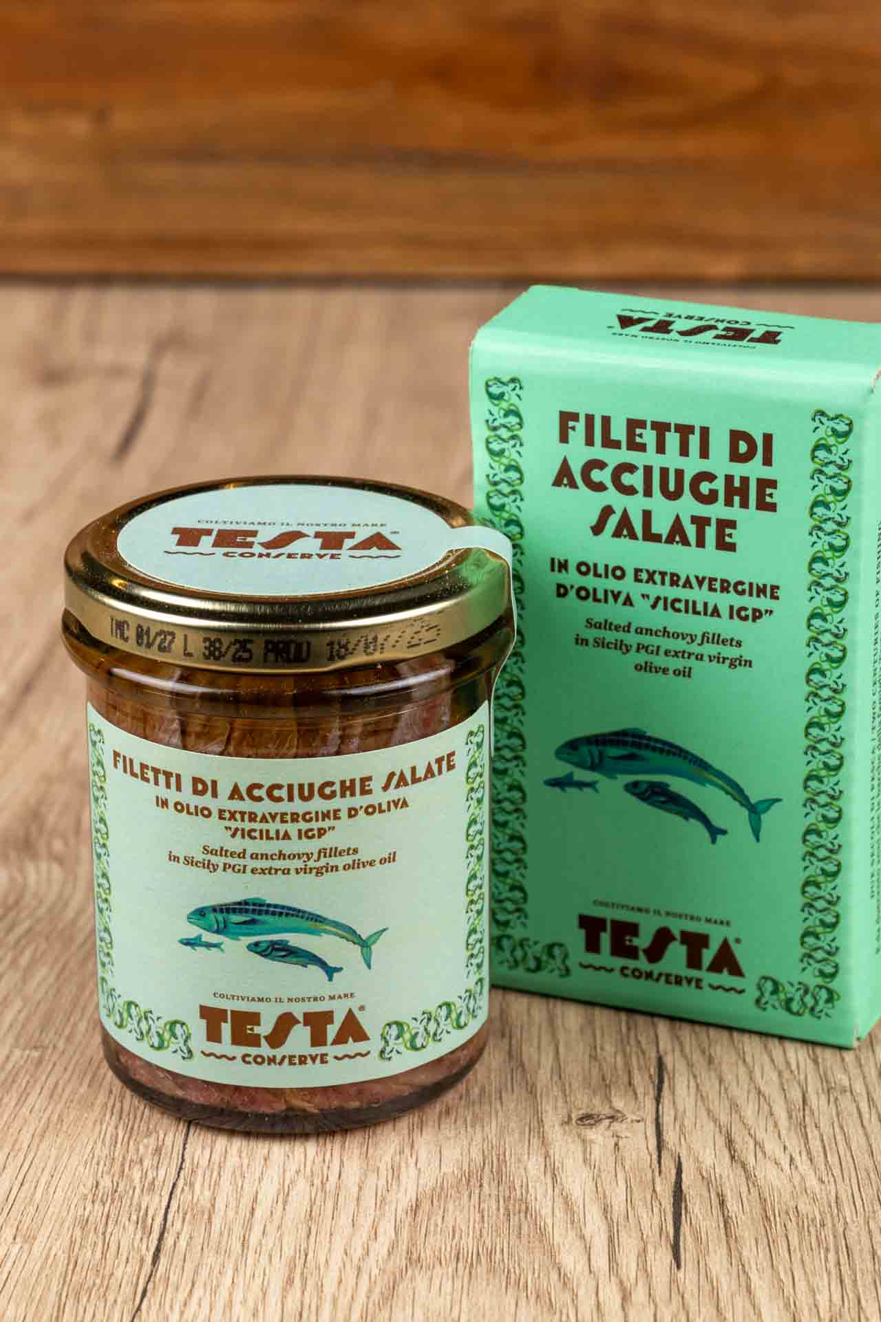 I filetti di acciughe salate marca Testa sono ottenuti da Acciuga europea selezionate e lavorate secondo la tradizione in Sicilia dall'azienda Testa Conserve.